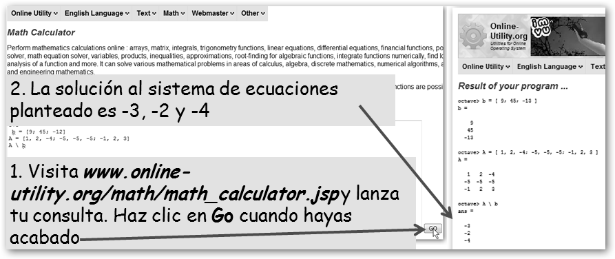 Finalmente, otras opciones son: 1. Online-Utility en www.online-utility.org/math/math_calculator.jsp una potente calculadora que corre bajo Octave. Fíjate que A es la matriz de coeficientes y b el de términos independientes, el sistema de ecuaciones se expresa como Ax=b y la petición a Octave de resolución es A \ b. ¡No te preocupes si no lo entiendes ahora! Veremos cómo resolver sistemas de ecuaciones en el capítulo 9. |