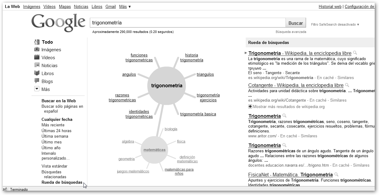 Si haces clic en Más herramientas en el panel de la izquierda, Google nos permite buscar con la opción Rueda de búsquedas información en forma de rueda o mapa conceptual con los términos de la búsqueda en el centro de la burbuja (p.e. matemáticas), a su vez, podemos expandir cualquier rama (en la figura trigonometría).