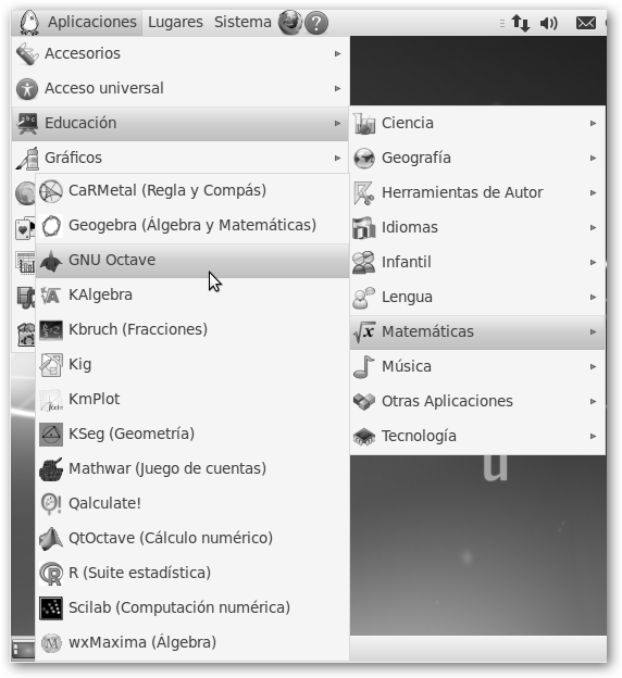 Gnuplot y R. También, puedes hacerlo desde el intérprete de comandos. 1 Abre la consola desde Aplicaciones, Accesorios, Terminal. 2. Teclea sudo apt-get install speedcrunch maxima xmaxima wxmaxima yacas qtoctave octave3.2 gnuplot r-base e instalarás todos los programas “del tirón”. Observa que no se incluye Microsoft Mathematics porque esta aplicación sólo está disponible para Windows.