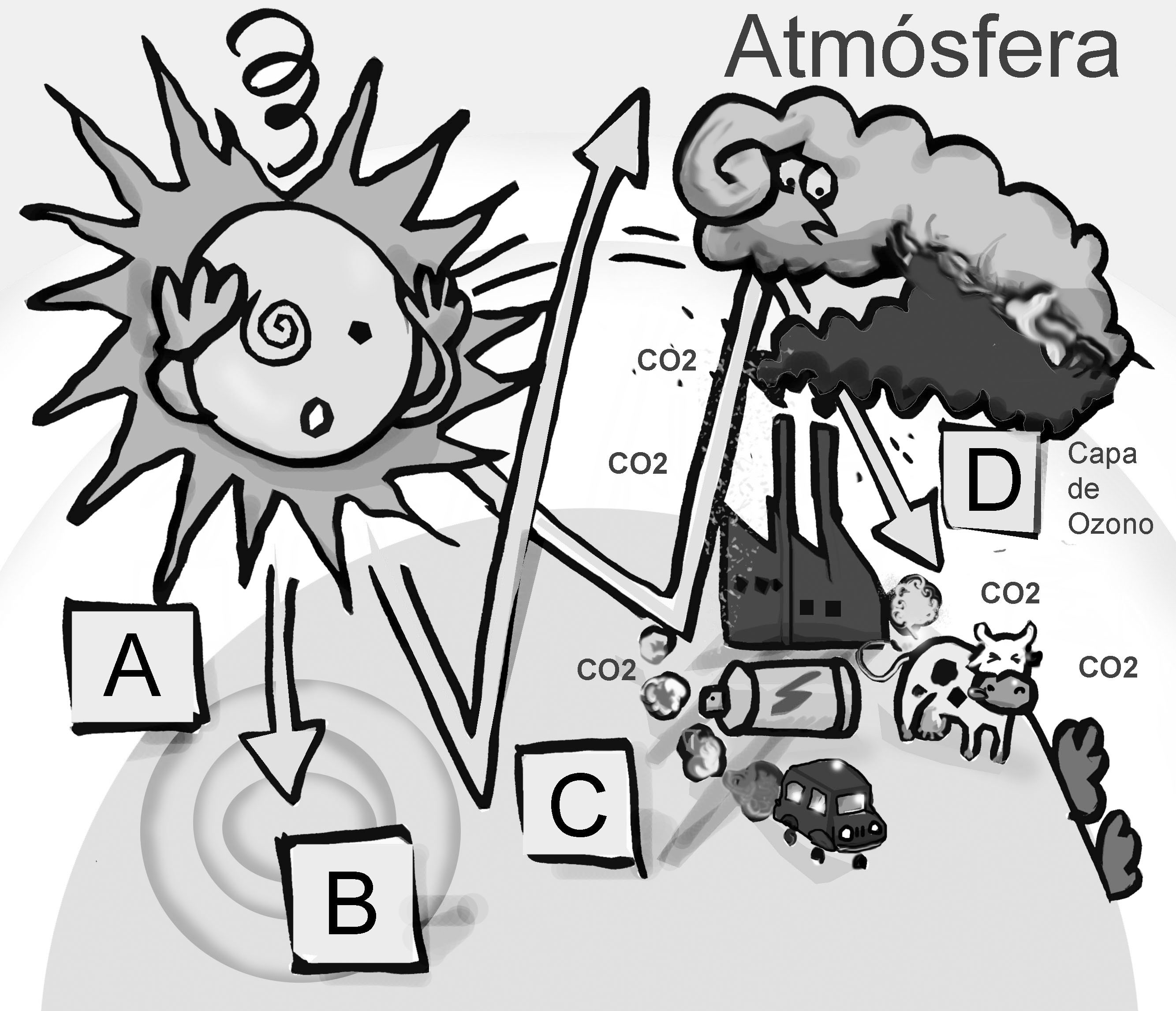 I. La energía solar entra en la atmosfera (A). II. Parte de este calor es absorbido por la Tierra (B) pero no todo (C). III. Los gases del efecto invernadero retienen parte de la radiación reflejada por la superficie terrestre (D). |