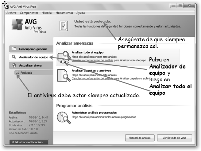 Si instalas un programa, hazlo desde la página oficial y analízalo con un antivirus antes de abrirlo. Además, para una información más detallada, puedes visitar la Oficina de Seguridad del Internauta en http://www.osi.es/ y, más concretamente, en la sección Protégete haz clic en Acceso a la sección Protege tu PC.