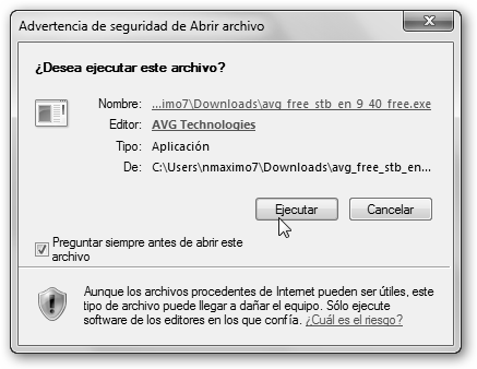 En esta pantalla Internet Explorer te muestra una advertencia de seguridad. ¿Por qué? Porque una de las maneras más fáciles de dejar vulnerable tu sistema es instalando programas maliciosos de páginas web no seguras, de software pirata obtenido mediante clientes p2p (Emule, Ares), etc.