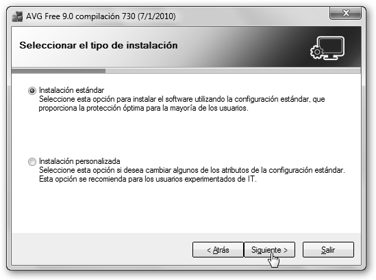 6. Elegimos la Instalación estándar y pulsamos en Siguiente para activar la licencia. |