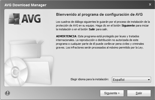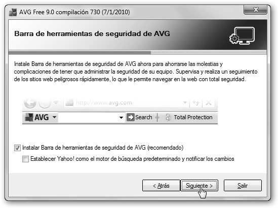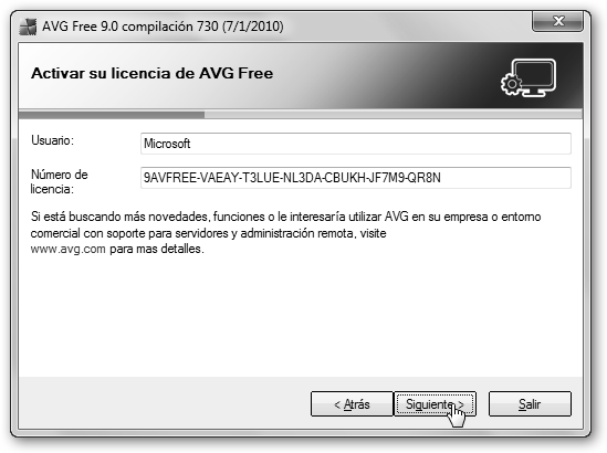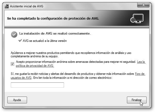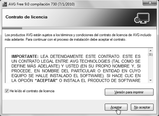 5. Selecciona el idioma Español, Deseo instalar la protección básica gratuita de AVG Anti-Virus Free y He leído el contrato de licencia. Navega por las distintas ventanas del asistente de instalación pulsando Siguiente y Aceptar. |