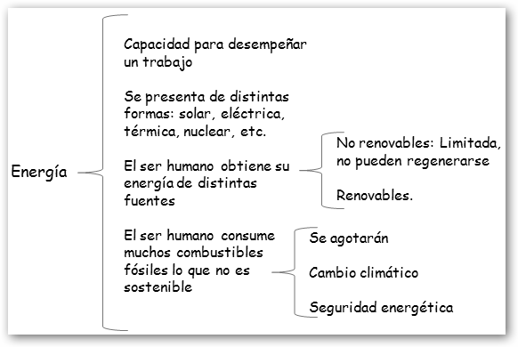 La energía es la capacidad para desempeñar un trabajo. Se presenta de distintas formas: solar, eléctrica, térmica, nuclear, etc. El ser humano obtiene su energía de diversas fuentes de energía. Pueden ser renovables y no renovables. Las renovables pueden regenerarse, las no renovables (combustibles fósiles) no, pues se encuentran en la naturaleza de forma limitada. El ser humano consume muchos combustibles fósiles lo que no es sostenible: 1) Los combustibles fósiles se agotarán; 2) La quema de combustible fósiles contribuye al cambio climático; 3) Seguridad energética, es decir, nos crea una dependencia de naciones poco de fiar.