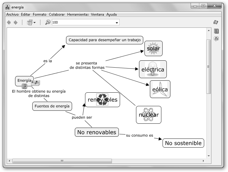 Veamos el mapa conceptual del ejemplo anterior realizado con el programa gratuito CMapTools que puedes descargar de http://cmap.ihmc.us/.