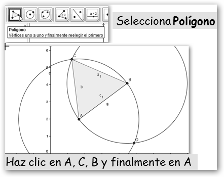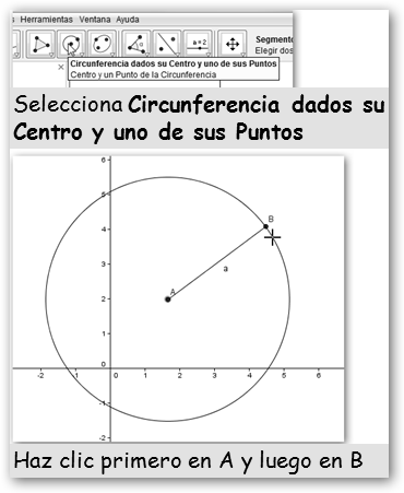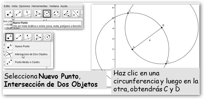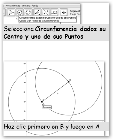 2.4. Dibuja otra circunferencia, pero ahora con centro B y radio a. 2.5. Señala los puntos intersección de las dos circunferencias. |