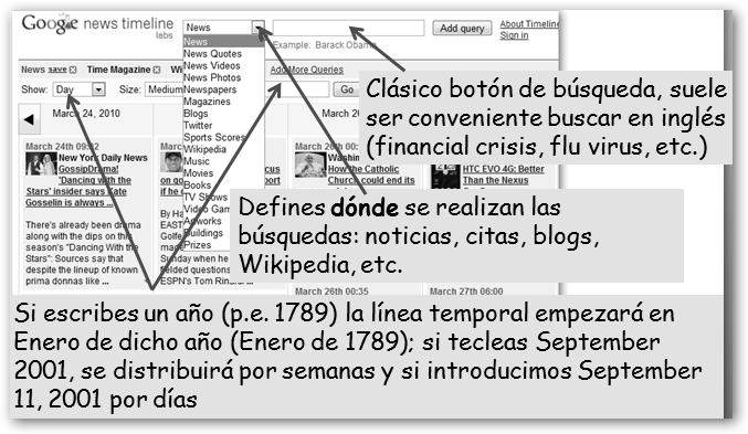 Si precisas buscar información, realizar trabajos, aclarar dudas, etc. una herramienta que te puede resultar útil es Google news timeline en newstimeline.googlelabs.com. Se trata de una aplicación web que organiza los resultados de la búsqueda en orden cronológico. |
