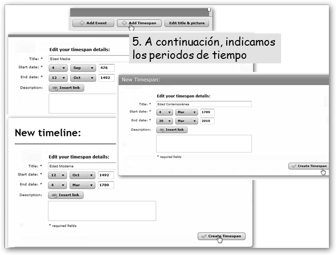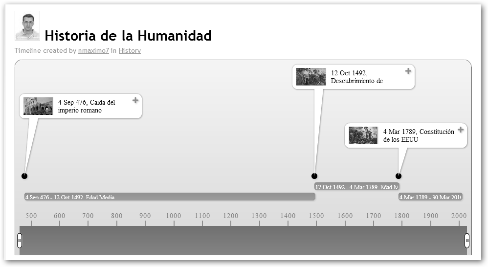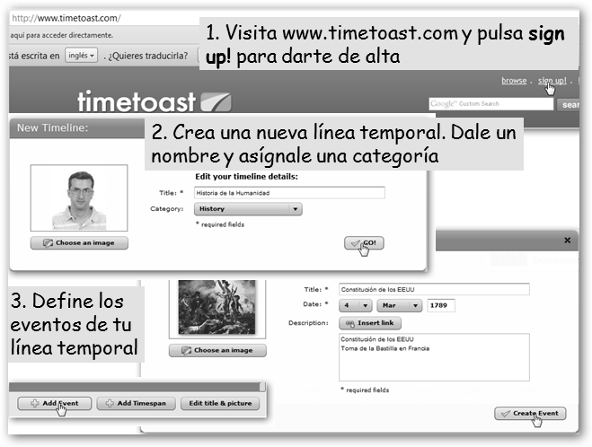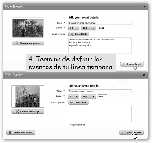 Sigue los pasos que te explicamos a continuación y obtendrás un resultado como el que ves en la figura. Procura añadir a cada evento una imagen, comentario, descripción, etc., es decir, algo que facilite su memorización. |