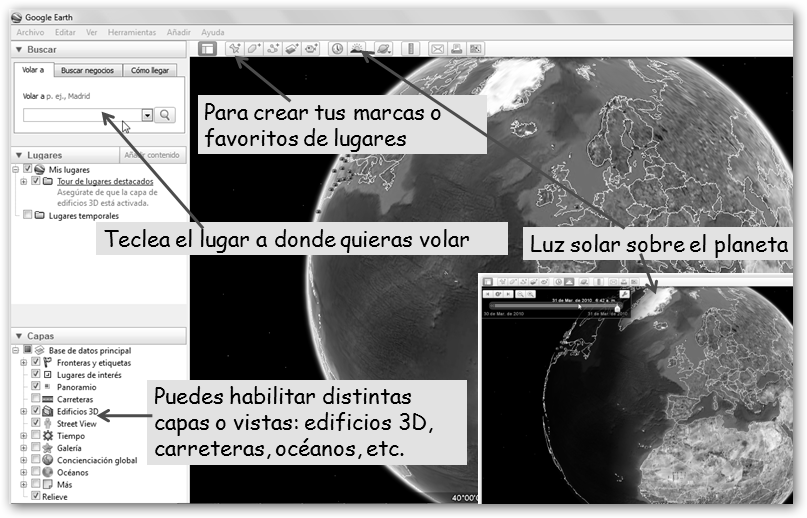 En Herramientas, Entrar al simulador de vuelo o con las teclas Ctrl + Alt + A accedes a un simulador de vuelo. ¿Quién dijo que estudiar Geografía no es divertido? |