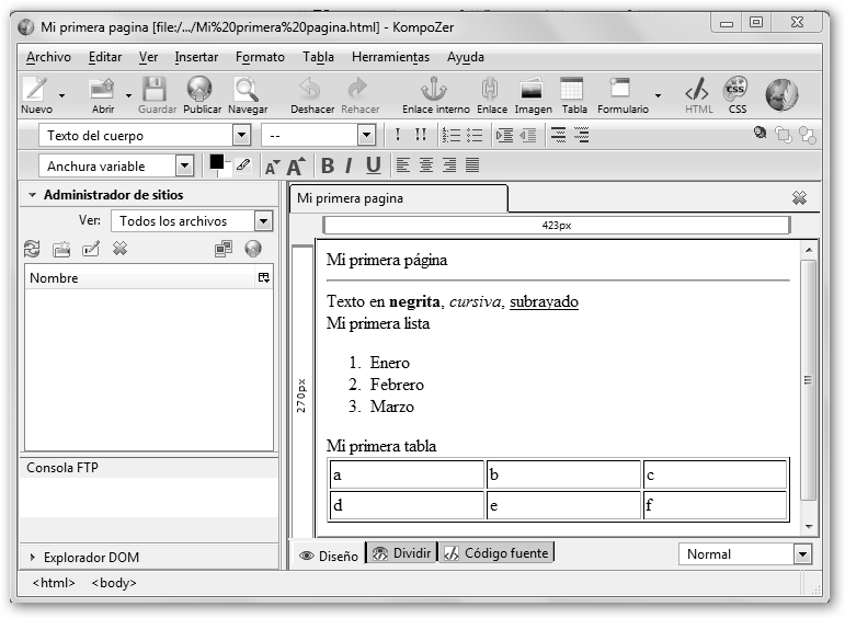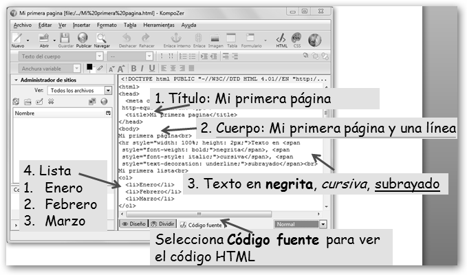 Fíjate en las dos figuras inferiores KompoZer te permite alternar entre dos vistas: la de Diseño(la vista amigable) y Código fuente (la verdadera piel de la página escrita en HTML, la que realmente entienden los navegadores web como Internet Explorer o Firefox). |