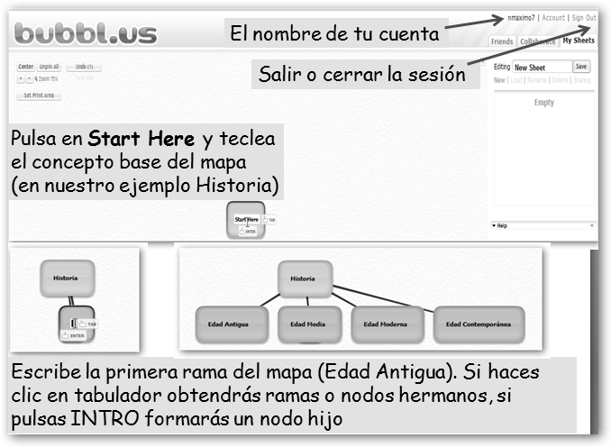 Existen muchas herramientas para realizar mapas conceptuales, pero bubbl.us destaca por su simplicidad y porque no requiere instalación. Veamos los pasos a seguir: 1. Navega a www.bubbl.us y pulsa en Start Brainstorming, comienza la lluvia de ideas. 2. Date de alta en el servicio. 3. Crea el mapa conceptual. |