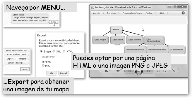 Otras alternativas 2.0: Min42 (www.mind42.com/), MindMeister (www.mindmeister.com) sólo permite 3 mapas gratis, Mindomo (www.mindomo.com/) y WiseMapping (www.wisemapping.com/).