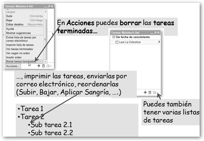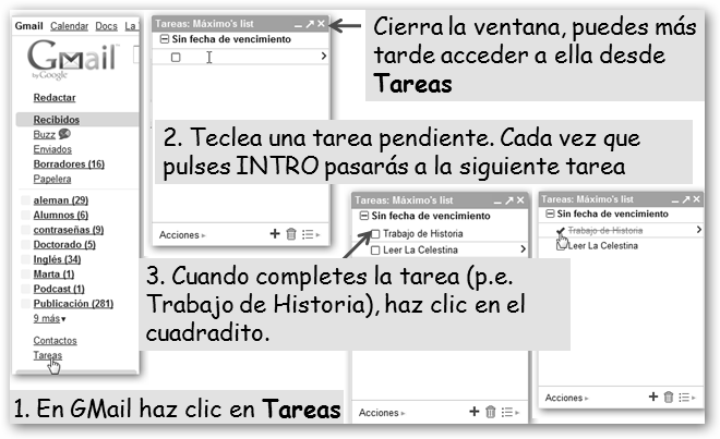 * Tareas: Mantienes una lista de tareas pendientes (por ejemplo, realizar el trabajo de Historia, terminar de leer el libro de Literatura, etc.). Dicha aplicación forma parte de GMail.