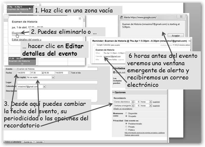 5. Cualquier evento que hayas definido puedes eliminarlo o modificarlo más tarde, por ejemplo, las notificaciones o recordatorios.