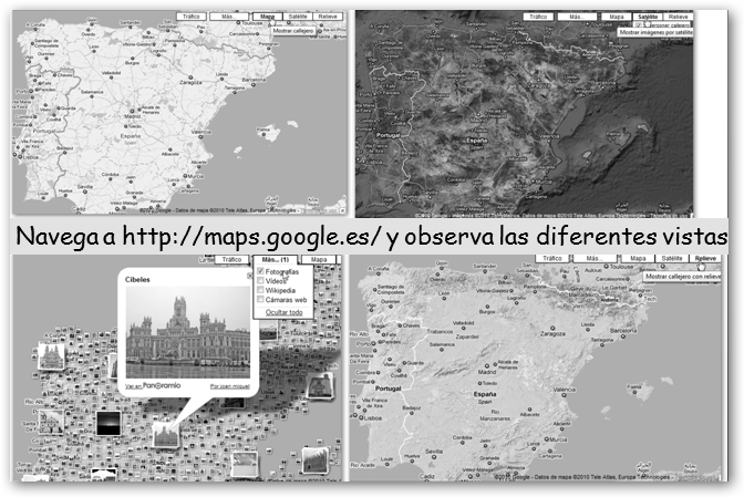 Como puedes comprobar en la imagen en Google Maps dispones de diferentes vistas, a saber: Mapa, Satélite, Relieve, Más (Fotografía, Vídeos, Wikipedia, Cámaras web). |