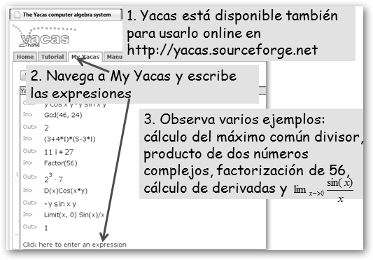 * GNU Octave: alternativa a Matlab para cálculo numérico, www.gnu.org/software/octave . * Maxima: maxima.sourceforge. net. * R: alternativa libre al paquete estadístico SPSS, www.r-project.org. * Yacas: junto a Maxima diseñado para el cálculo algebraico, yacas.sourceforge.net. * Gnuplot: representación de funciones, www.gnuplot.info.