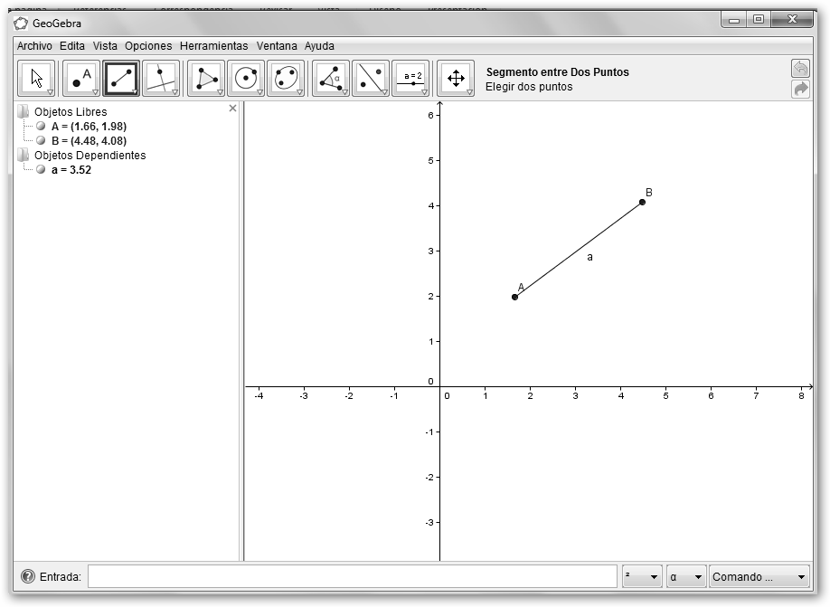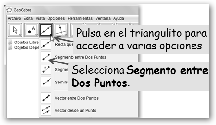 Paso 2. Una vez instalado, dibujemos un triángulo equilátero. 2.1. Empieza dibujando un segmento. 2.2. Haz clic dos veces sobre el área de trabajo y obtendrás un segmento. |