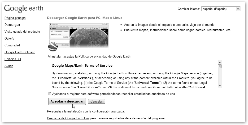 Navega a earth.google.es, pulsa en Descargar Google Earth y acepta los términos del servicio. |