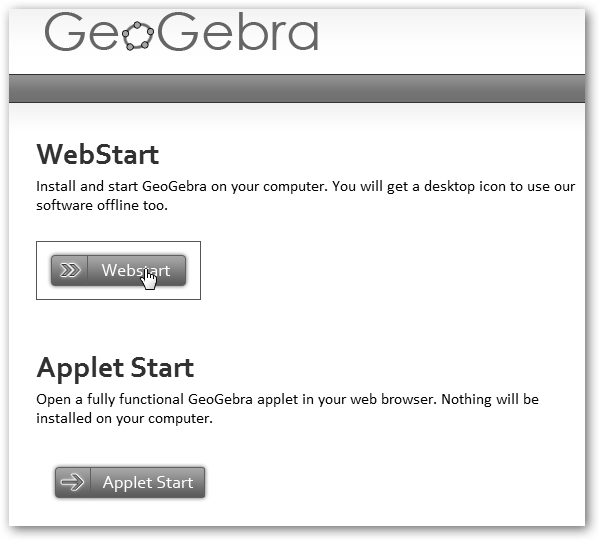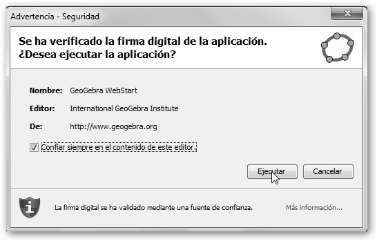 Puedes pulsar en Applet Start para utilizarlo como un applet en tu navegador, sin la necesidad de instalar ninguna aplicación en tu equipo de escritorio. Para instalarlo en tu equipo selecciona primero el botón Webstart y luego pulsa en Ejecutar para permitir al asistente comenzar el proceso de instalación. |