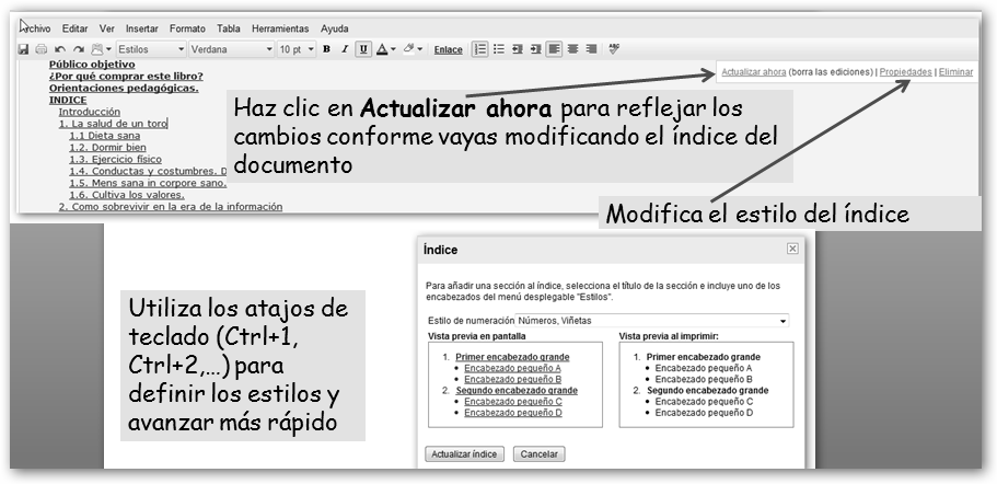 2. A los principales epígrafes del documento asígnales el estilo Titulo 2, los subapartados, el Título 3, etc. 3. Crea el índice desde Insertar, Índice. |