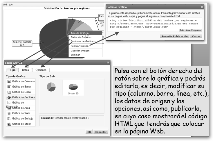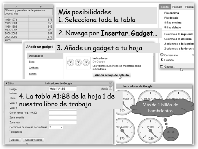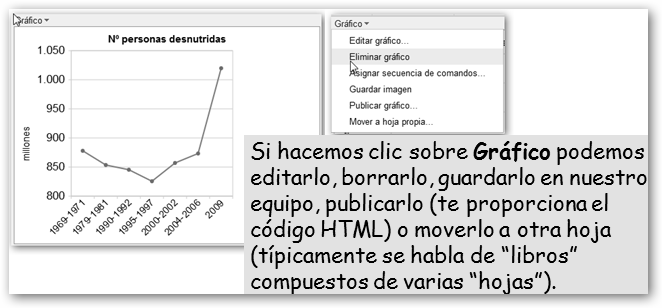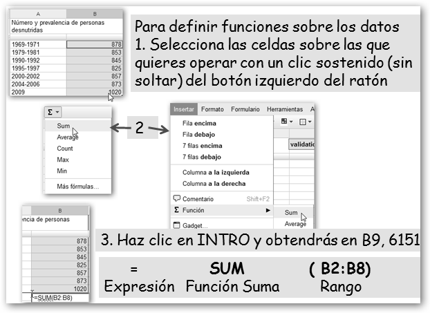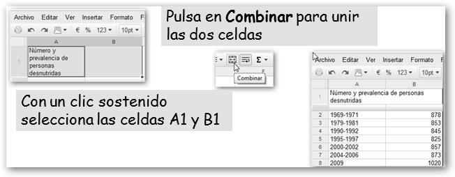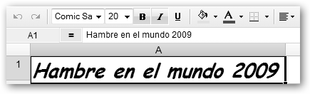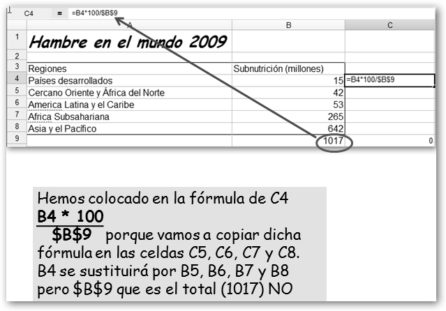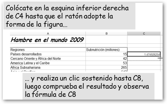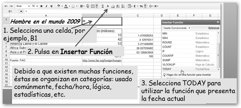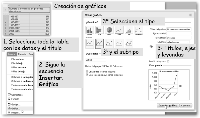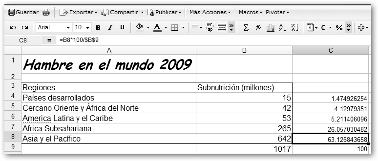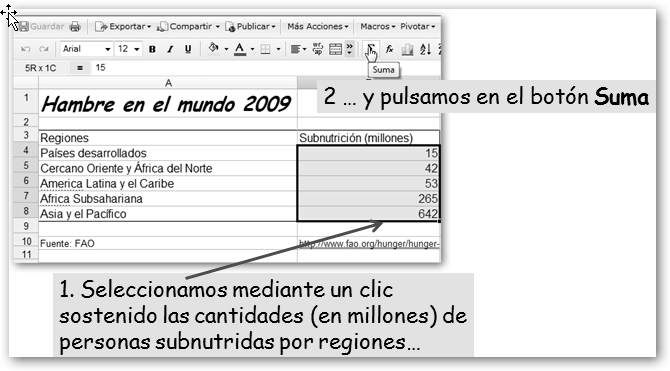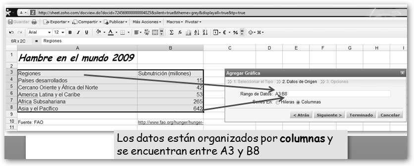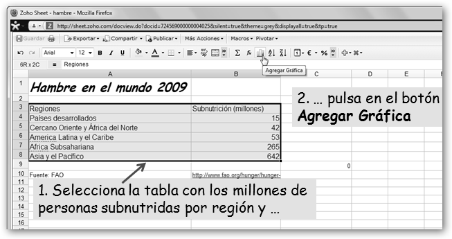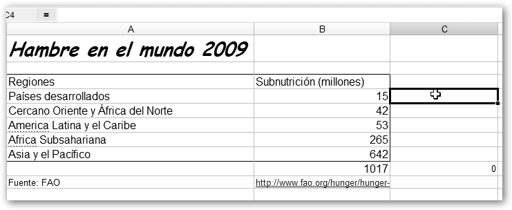 Dale un nombre a tu nueva hoja. Vamos a realizar un trabajo sobre el hambre en el mundo. Primero, precisamos los datos. Si, por ejemplo, sabes que debe haber algo en la FAO, realizamos la búsqueda en Google con la cadena : hambre mundo site:fao.org y encontramos la dirección http://www.fao.org/hunger/hunger-home/ es/. En ella encontraremos los datos que nos van a permitir realizar un gráfico y los insertaremos en nuestra hoja de cálculo. |