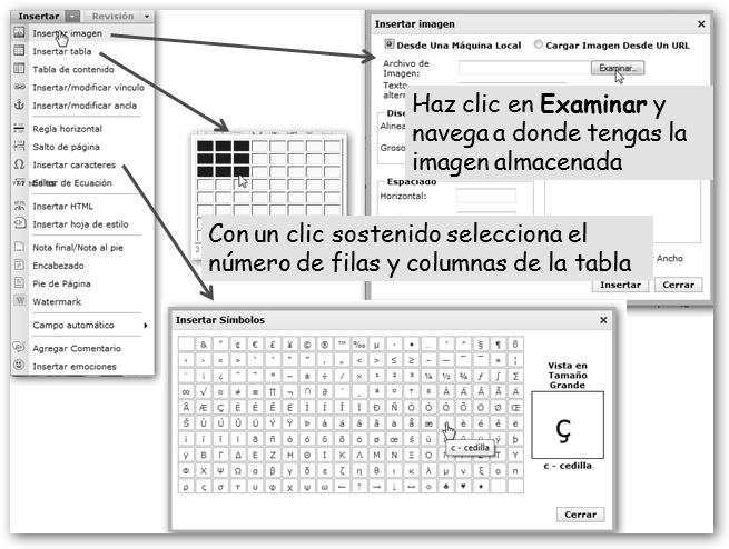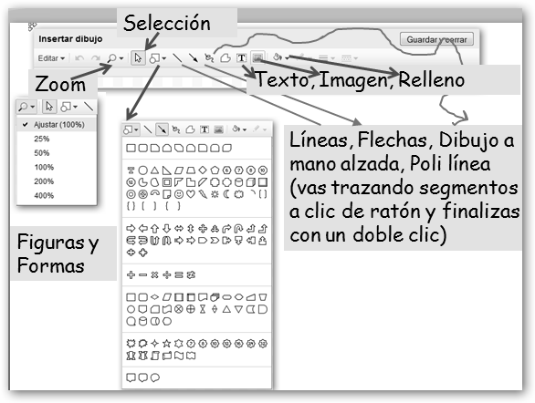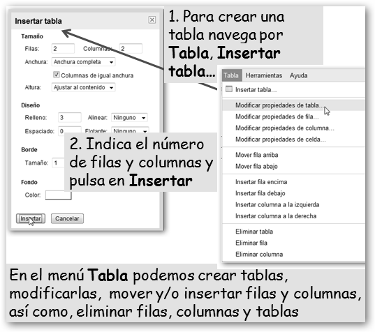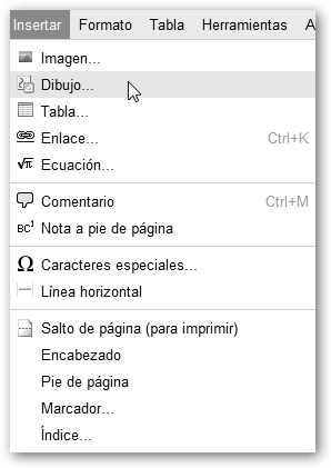 Desde el menú Insertar podrás agregar una… * Imagen al documento desde tu equipo o Internet y, opcionalmente, podrás configurar el tamaño, posición y si el texto se ajusta alrededor de la imagen. * Un Dibujo: véase la figura adjunta. * Una Tabla: indicarás el número de filas y columnas y, opcionalmente, el color de fondo, tamaño y color del borde, etc. |
