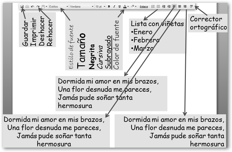 También podemos crear documentos de texto, en este caso navega a tu carpeta TrabajoClase y selecciona Nuevo, Documento. A partir de aquí comienza a escribir como en cualquier otro procesador de textos, tienes las siguientes opciones en el menú Formato. |