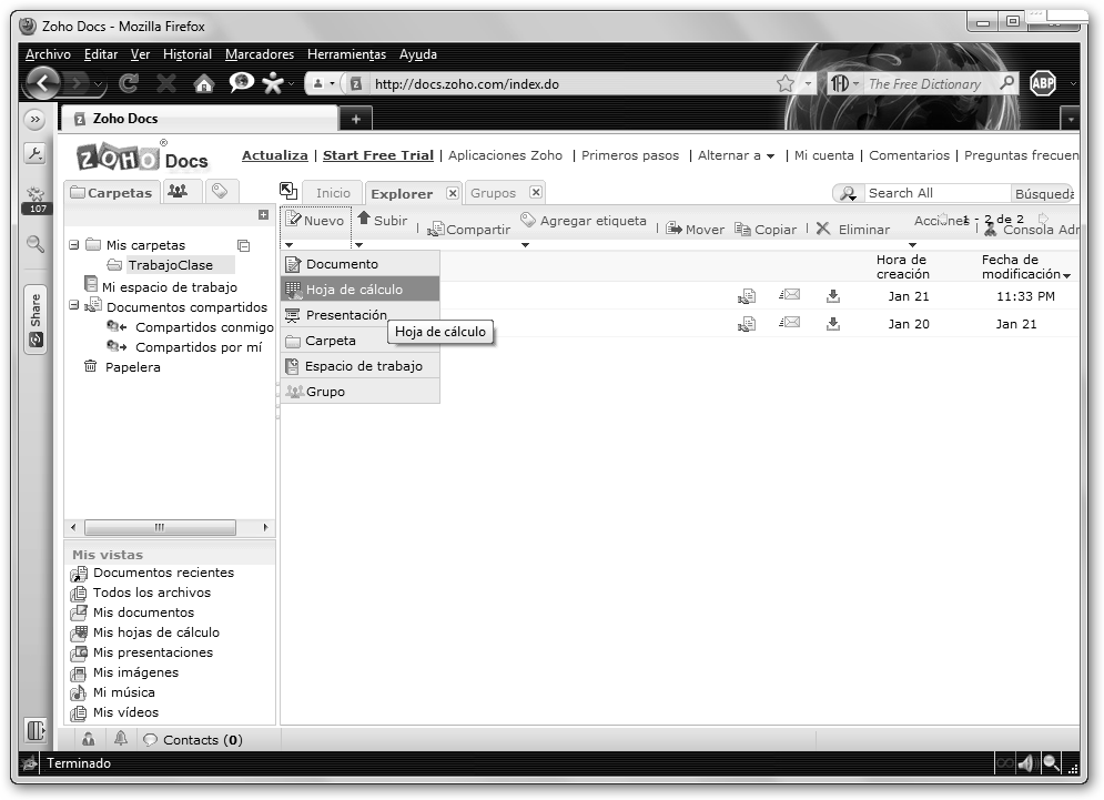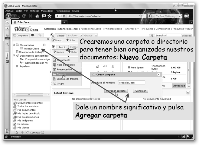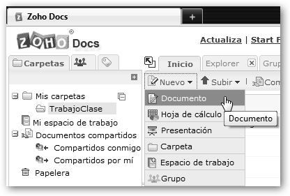 Haz clic en el enlace Try Now a la derecha de Zoho Docs para gestionar nuestros documentos online. Lo primero que realizaremos es crear una carpeta TrabajoClase. |