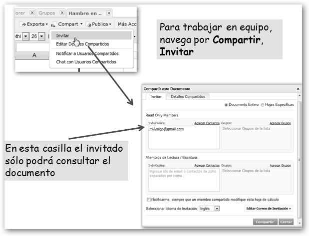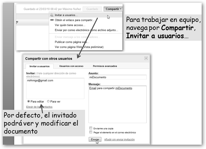 Obviamente la solución adoptada por Google Docs es la segunda. Una vez creado el documento, invitaremos a los usuarios a ver o editar el documento por correo electrónico tal como se muestra en la figura. |
