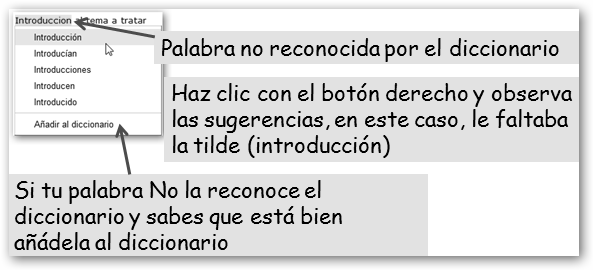 En Revisión tienes las siguientes opciones: * Comprobar ortográfica: No olvides nunca pasar el corrector ortográfico en todos tus documentos. * Diccionario personalizado: Si alguna palabra está marcada durante la corrección ortográfica y sabes que está bien puedes añadirla y crear tu diccionario personal. |
