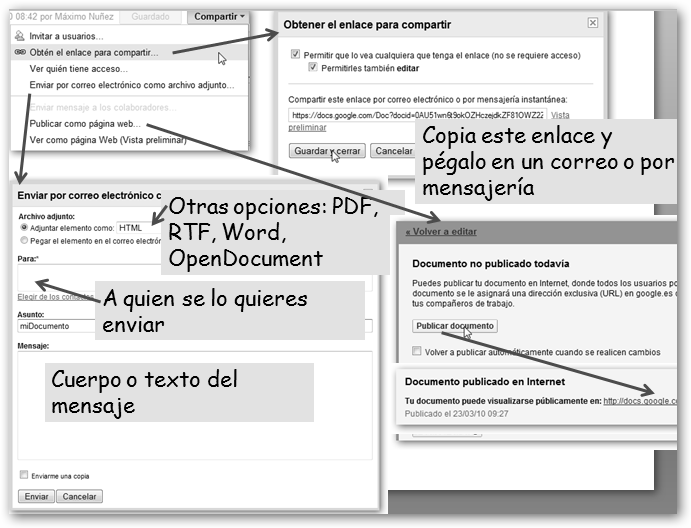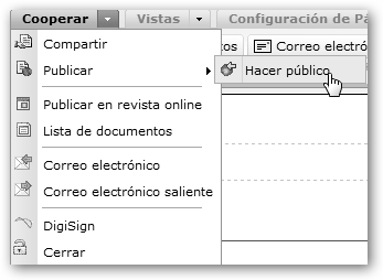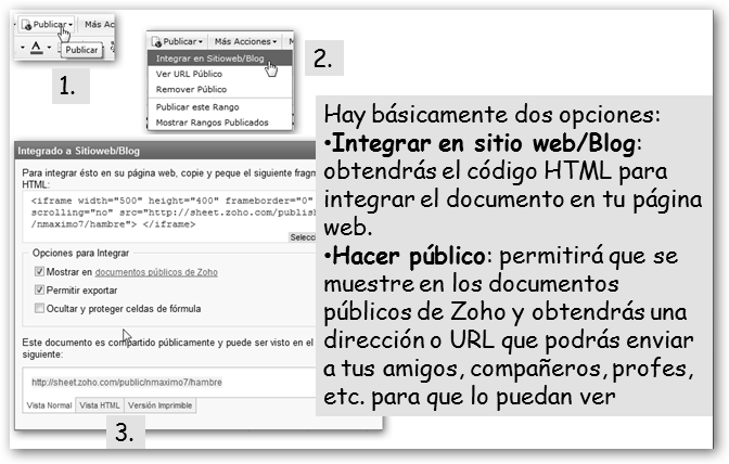 En el menú Cooperar puedes enviar el documento por correo electrónico, compartirlo con tus amig@s, publicarlo en tu blog (típicamente en Blogger o WordPress), incrustar el documento en tu página web mediante el código HTML que te proveen, etc. |