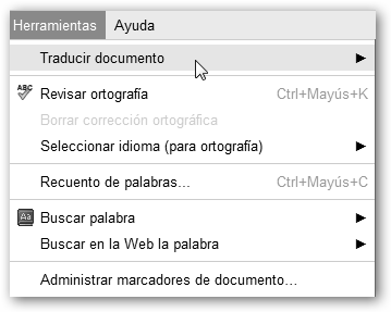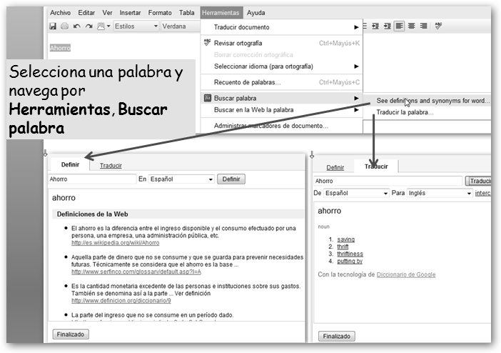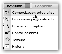 * Buscar y reemplazar: permite buscar una palabra y, opcionalmente, reemplazarla por otra. * Contar palabras: muestra el número de palabras y caracteres tanto del texto seleccionado como de todo el documento. * Tesauro: diccionario disponible sólo en inglés. * Historia: te permite navegar por las distintas versiones del documento y recuperarte de errores, cambios no deseados o volver a disponer de información que en algún momento eliminaste. |