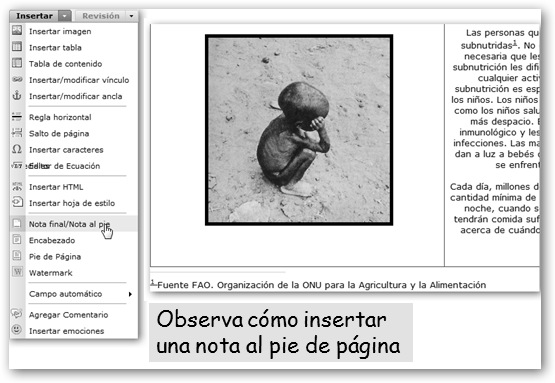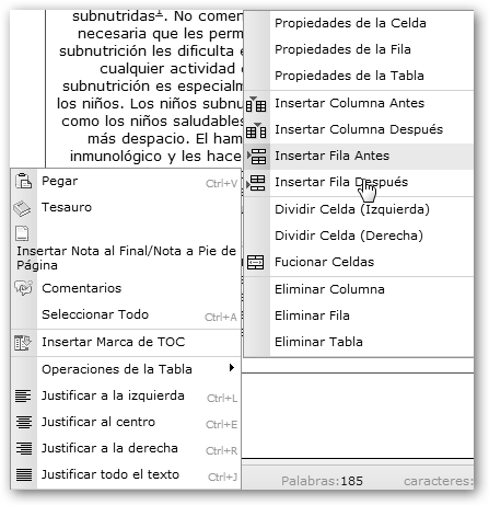 Con un clic en el botón derecho del ratón podrás realizar diferentes acciones: * Sobre una tabla podemos insertar filas o columnas, eliminar filas, columnas o toda la tabla, dividir o fusionar celdas. * Sobre un texto o palabra podemos cortar, copiar y pegar, utilizar el tesauro, justificar a la izquierda, centro, derecha o todo el texto. * Si se trata de una imagen puede justificarse, añadirle un borde, etc. |