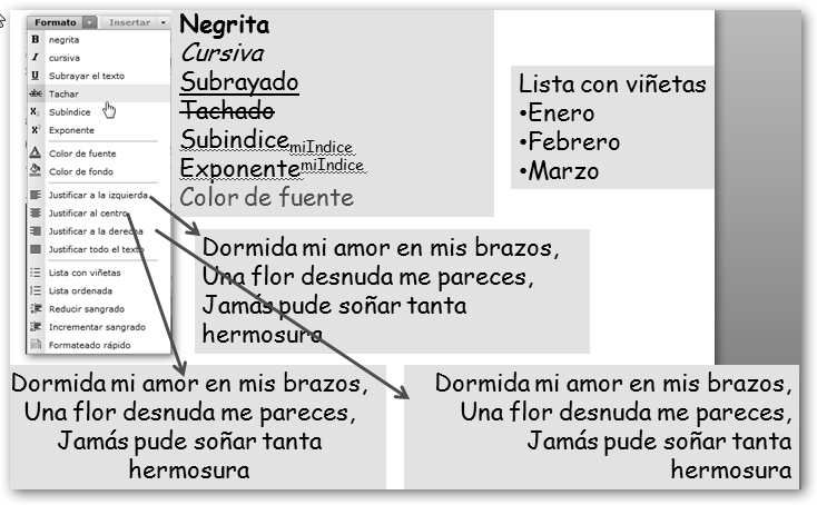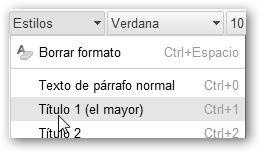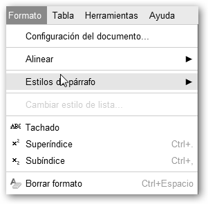 En el menú formato se encuentra: * Configuración del documento: fuente y tamaño del texto sin formato, interlineado y color de fondo. * Alinear: izquierda, derecha, centrar y justificado (alinea tanto a la derecha como a la izquierda). * Estilos de párrafo: Texto normal, Título 1, 2,… Útil no sólo para la presentación del documento sino también para crear el índice. |