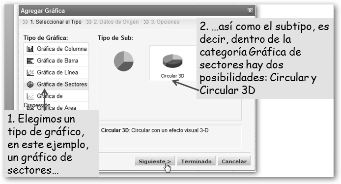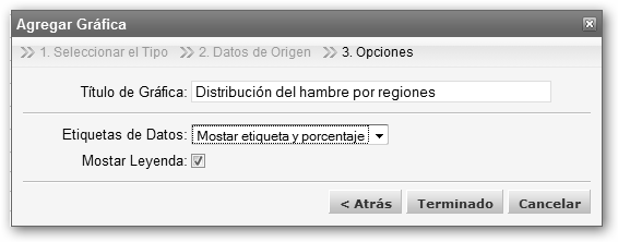 Dale un título a la gráfica, selecciona Mostrar etiqueta y porcentaje en Etiqueta de Datos y pulsa en el botón Terminado. |