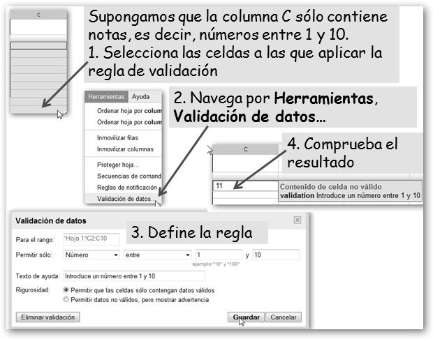 ¿Qué más podemos hacer? * Insertar comentarios descriptivos, dibujos o imágenes desde el menú Insertar. * Imprimir nuestro trabajo: Archivo, Imprimir. * Guardarlo en nuestro disco como PDF, hoja de Excel, OpenOffice, etc.: Archivo, Descargar como. * Protegerla de ediciones no autorizadas (Herramientas, Proteger Hoja) o compartirla. * Finalizar la edición de nuestra hoja: Archivo, Guardar y cerrar. * Definir reglas de validación (Herramientas, Validación de datos) para restringir el contenido de las celdas. |