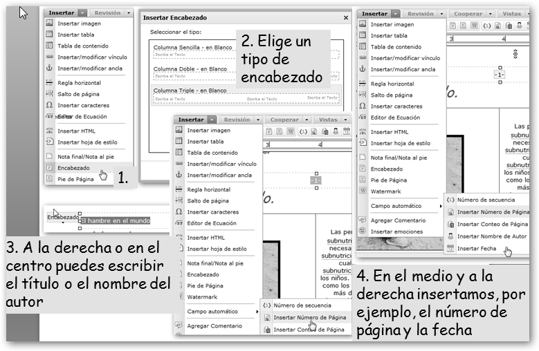 En la segunda fila se encuentran las opciones de Deshacer (los últimos cambios realizados), Rehacer, Cortar, Copiar y Pegar. Finalmente, insertaremos un encabezado lo que mejorará notablemente la presentación de nuestro documento.