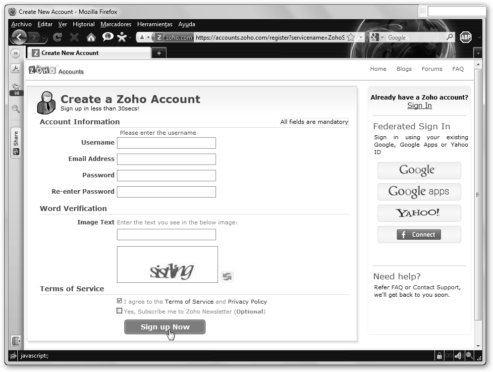 Rellena los campos: nombre de usuario, correo electrónico, contraseña, texto de la imagen (para que Zoho compruebe que no eres un robot), acepta los términos del servicio y la política de privacidad y haz clic en Sign up Now. |