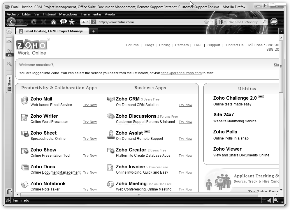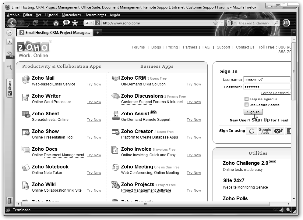 Ya podemos acceder, navega a www.zoho.com, introduce el nombre de usuario, la contraseña y pulsa Sign In. |