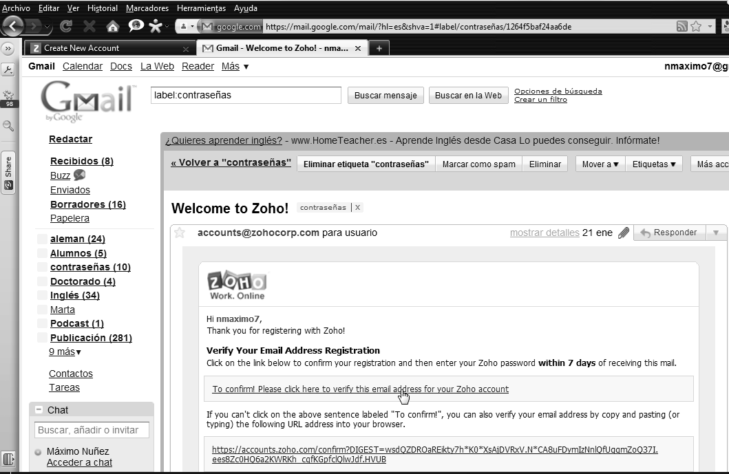 Tendrás que confirmar tu registro desde tu cliente de correo. Recibirás un correo de Zoho y tendrás que hacer clic en el enlace To confirm! Please click here to verify this email address for your Zoho account. |