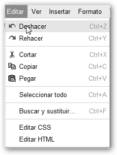 En el menú Editar tienes las opciones típicas: Deshacer, Rehacer; Típicamente utilizarás un montón la combinación: 1. Cortar (para mover), o Copiar (para disponer de varias copias) un texto o fragmento y, luego, 2. lo Pegas donde quieras; Buscar y sustituir, para buscar una palabra o frase y/o reemplazar una palabra por otra; Editar CSS y Editar HTML, si tu propósito es crear una página web precisarás editarla en HTML y podrás, opcionalmente, asignarle una hoja de estilo CSS. |