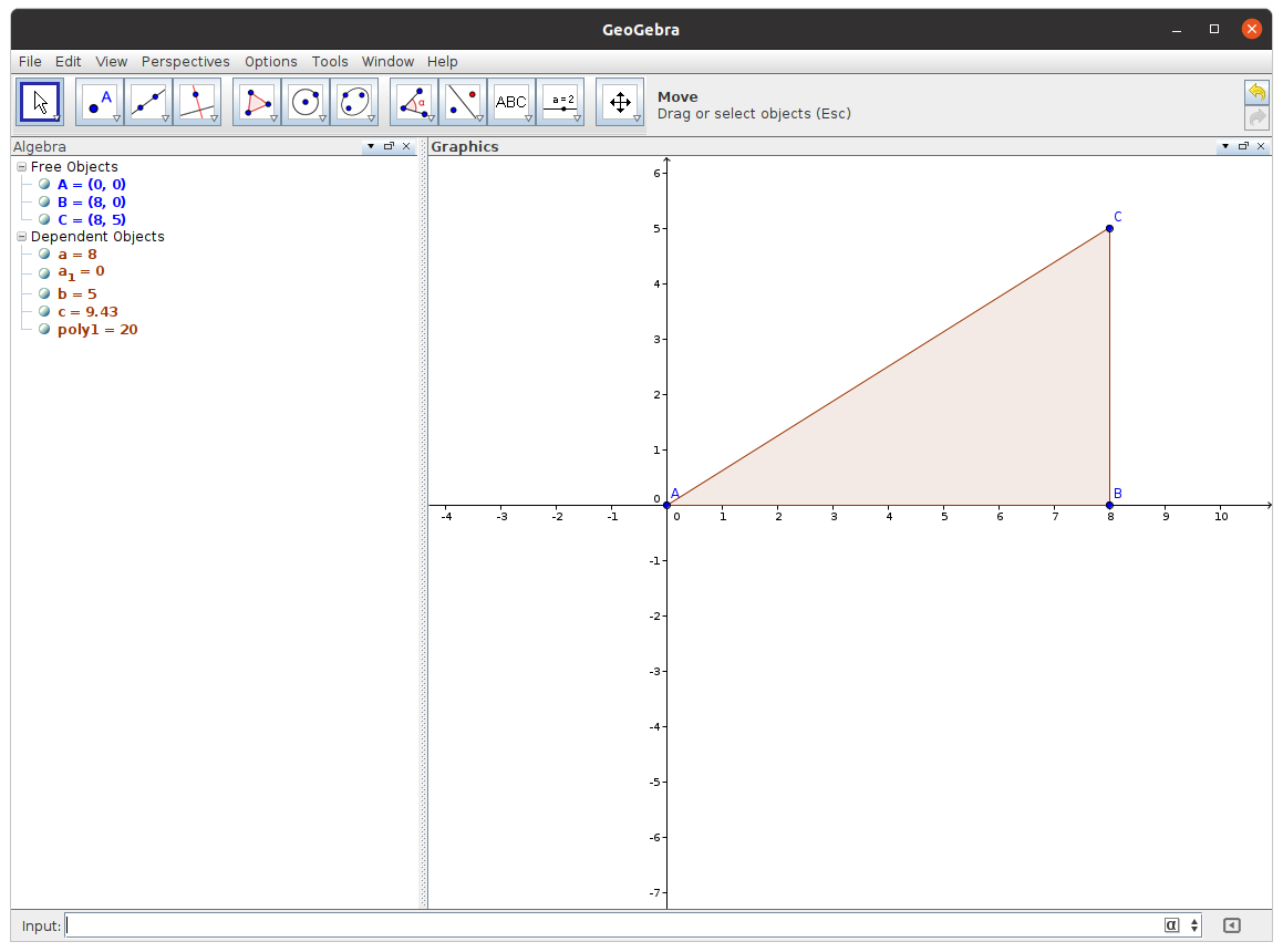 Let’s use Geogebra to visualize complex numbers. More specifically, let’s visualize 8 + 5i. First, we will draw a triangle. Select Polygon, and click on the points or vertices (0, 0), (8, 0), (8, 5), and then the first point again (0, 0) to complete the triangle. Alternatively, you can type in the input field: A = (0, 0), B = (8, 0), C = (8, 5), Polygon![A, B, C, A]. Complex numbers in Geogebra