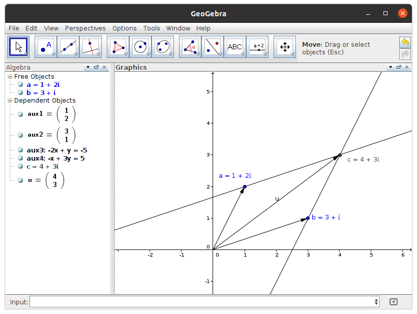 Finally, select the option Vector between Two Points from the menu Line through Two Points, and click on the starting point (0, 0) and c or type Vector![(0, 0), c]. Observe that A (1, 2) (a, 1 +2i) + B (3, 1) (b, 3 +i) = (4, 3) (c, 4 +3i). Addition of complex numbers with Geogebra