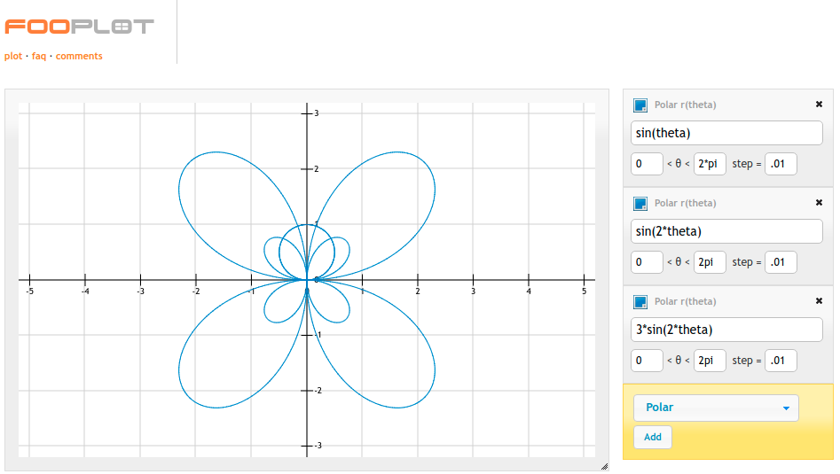 r(theta) = 2 is the equation of a circle of radius R = 2 centered at the origin in polar coordinates. The graphs of the sine (sin(theta), theta in ![0, pi]) and cosine functions (cos(theta), theta in [0, pi]) in polar coordinates are circles, too. sin(2*theta), theta in [0, 2*pi] is a rose with four petals. Remember that sin(theta), theta in [0, pi], was a circle, so sin(2*theta), theta in [0, pi⁄2] is a petal in the first quadrant, and sin(2*theta), theta in [pi⁄2, pi] is the second petal in the second quadrant and so on, [pi, 3pi⁄2] and [3pi⁄2, 2]. 3sin(2theta) is the same rose with four petals, but three times the radius. Polar Plots with fooPlot