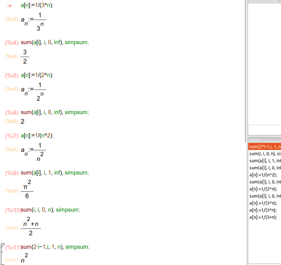 a[n]:=1/(2^n); is a geometric series with r=1⁄2<1. It converges to the sum a⁄1-r = 1⁄1-1⁄2 = 1⁄1⁄2 = 2. wxMaxima can compute other series, too: a[n]:=1/(n^2); it converges to π2⁄6. We can find the sum of the first n terms of a series: sum(i, i, 0, n), simpsum; = n2 + n⁄2 or sum(2*i-1,i, 1, n), simpsum; = n2.
