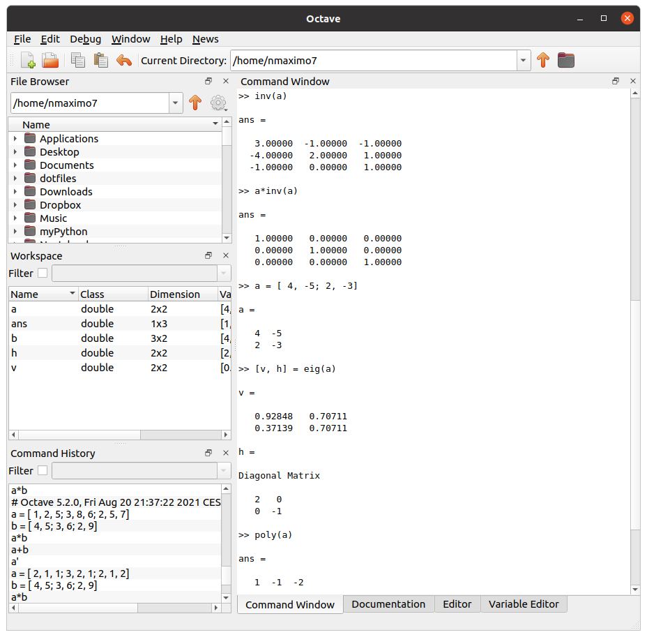 Thus, |A - λI| = (λ1 -λ) (λ2 -λ)…(λn -λ) where λ1, λ2, ….λn are the eigenvalues of A. In our example, ![v, h]=eig(a) returns the eigenvalues λ1 = 2 and λ2=-1, and |A - λI| = (λ1 -λ) (λ2 -λ) = (2 -λ)(-1 -λ) = λ2 -λ -2 (poly(a) returns the characteristic polynomial of a). You can double check: det(a-2*eye(2)) (eye(2) returns a square 2*2 identity matrix) = 0, det(a+eye(2)) = 0, and det(a) = -2 = λ1*λ2. Working with matrices in Octave