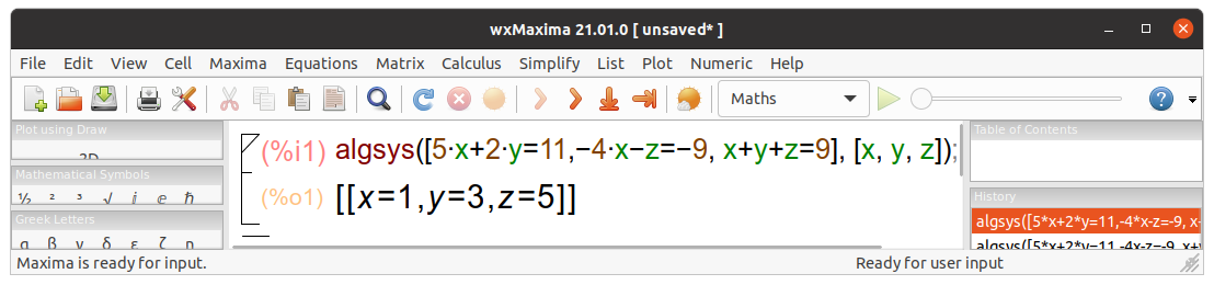 Maxima’s command algsys (![expr_1, …, expr_m], [x_1, …, x_n]) solves the simultaneous polynomial equations expr_1, …, expr_m for the variables x_1, …, x_n, e.g., algsys([5*x+2*y=11,-4*x-z=-9, x+y+z=9], [x, y, z]); Solve a system of equations using Maxima