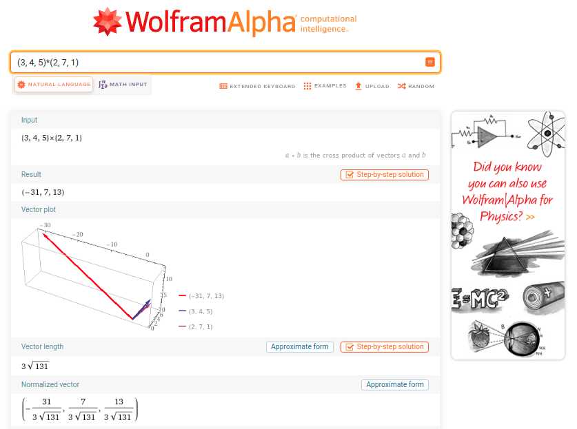 We can use Wolfram Alpha, too. For instance, (3, 4, 5)*(2, 7, 1) or {3, 4, 5}*{2, 7, 1} computes a cross product (it also returns a Vector plot, Vector length, and the Normalized vector); and {3, 4, 5}.{2, 7, 1} computes a dot or scalar product. Besides, we can perform some vector computations: {3, 4, 5} + {2, 7, 1}, {3, 4, 5}-3*{2, 7, 1}; {3, 4, 5}^3;