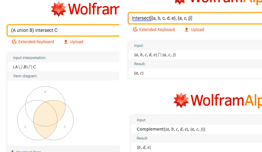 After that, you could try to ask for the intersection (Intersect![{a, b, c, d, e}, {a, c, j}]), difference (complement[{a, b, c, d, e}, {a, c, j}]), and union (union[{a, b, c, d, e}, {a, c, j}]) of the sets {a, b, c, d, e} and {a, c, j}. Finally, DisjointQ[{a, b, c, d, e}, {a, c, j}] return false because these two sets share “a” and “c” as common elements. Learning sets with WolframAlpha